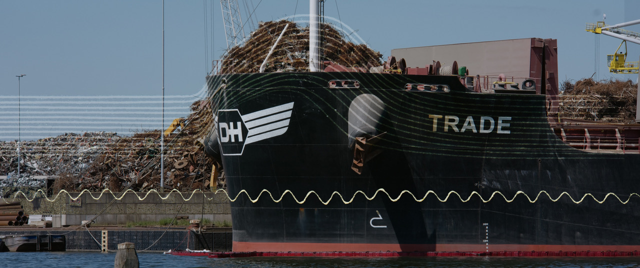 Van links naar rechts vaart een schip vol afval over het scherm. Van onder naar boven verzamelen zich golven – sporen, mogelijk van een verspild lichaam. In de haven van Amsterdam staat een schip in brand terwijl vingers op het scherm tikken: “Het ruikt naar verbrande toast.”